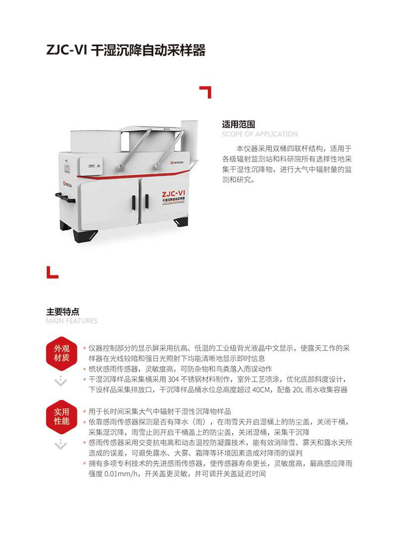 本儀器采用雙桶四聯(lián)桿結(jié)構(gòu),適用于各級(jí)輻射監(jiān)測(cè)站和科研院所有選擇性地采集干濕性沉降物,進(jìn)行大氣中輻射量的監(jiān)測(cè)和研究。