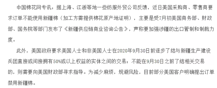 特朗普:考慮禁止由新疆棉制成的部分或全部產品!據《紐約時報》9月7日報道,三位知情人士透露,特朗普政府正在考慮一項禁令,禁止由中國新疆地區的棉花制成的部分或全部產品,潛在禁令可能最早于當地時間周二(8日)發布。知情人士稱,美方對此給出的理由,仍是所謂新疆“強制勞動、侵犯人權”之說。 當前,該禁令的范圍不明,不清楚禁令是否將涵蓋從新疆或中國其他地方運出的所有棉花產品,或者是否可能擴大到含有新疆棉花且從第三國發貨的產品。 報道截圖:出于所謂“人權”擔憂,美國可能對新疆棉花實施禁令 報道指出,特朗普政府的這項措施被稱為“暫扣令”(Withhold Release Order),將由美國海關及邊境保護局(CBP)發布。以所謂新疆存在“強迫勞動”為由,該局過去曾對一些私營公司發布過此類禁令,對相關進口產品進行扣留。并且,該局一直在考慮對更廣泛的商品類別采取更全面的行動。當前,美國海關及邊境保護局未對此作出回應。 今年7月,特朗普政府還曾將幾家服裝公司列入黑名單,阻止這些公司購買美國產品。這份名單包括一些主要國際服裝品牌的供應商,如拉夫·勞倫(Ralph Lauren)、湯米·希爾費格(Tommy Hilfiger)和雨果·博斯(Hugo Boss)的供應商。幾家中國公司及其供應的主要國際品牌都對這些舉措表示反對,并強調他們的供應鏈中并不存在所謂“強迫勞動”或其他“虐待勞工”的現象。 同月,美國國務院、商務部等曾聯合發布“新疆供應鏈商業咨詢公告”,警告企業不能讓供應鏈與新疆等地所謂“侵犯人權”的實體發生聯系。 中國新疆素有“棉花之鄉”之稱,是全國棉花主產區。國家統計局數據顯示,2019年新疆棉花產量達500.2萬噸,占全國總產量的84.9%,棉花總產、單產、種植面積、商品調撥量連續25年位居全國第一。中國在全球棉花生產、消費和貿易中的地位也十分重要。據中國棉花協會統計,2014年到2018年,我國平均植棉面積5002萬畝,平均產量568萬噸,占全球產量的23%。 《紐約時報》指出,特朗普政府任何阻止(新疆)棉花進口的舉措,都可能對全球服裝生產商產生巨大影響。同時,這項新禁令也可能導致一些大型服裝品牌撤離中國。在美國挑起事端、導致中美關系緊張時期,有公司正在尋求將服裝供應鏈轉移到越南、孟加拉國和印度尼西亞等地。然而,一些公司發現,他們難以復制中國的高質量生產模式,或者面臨著激烈的競爭。 部分美國客戶明確提出【訂單禁用新疆棉】或將面臨退貨!按照美國海關邊境要求,即日起通過所有渠道發往美國的貨物,外箱以及產品上都需貼上“Made in China”標簽,否則當地不允許進口! 美國對原產地證嚴查,對紡織企業出口來說,不單單是提高了關稅,更可能面臨退貨、沒收貨物或者罰款等風險! 同時據上海、江蘇、浙江等地一些紡織服裝外貿公司反饋,近日美國采購商、零售商要求訂單不能使用新疆棉(加工方需提供棉花原產地證明),主要是受7月初美國商務部、財政部、國務院等部門發布《新疆供應鏈商業咨詢公告》,聲稱要加強涉疆的出口管制和制裁力度。 7月20日,美國商務部把“與新疆侵犯人權有關”的11家中國公司列入被制裁實體清單,包括紡織企業。 未經美國政府批準,被列入黑名單的企業不能從美國企業購買零部件。 此次被加入實體列表的11家中國企業包括:昌吉溢達紡織、合肥寶龍達信息技術、合肥美菱、和田浩林發飾品、和田泰達服飾、今創集團、南京新一棉紡織、南昌歐菲光科技、碳元科技、新疆絲路華大基因科技、北京六合華大基因科技。其次還包括一些主要國際服裝品牌的供應商,如拉夫·勞倫(Ralph Lauren)、湯米·希爾費格(Tommy Hilfiger)和雨果·博斯(Hugo Boss)的供應商。 昌吉溢達紡織于2009年由溢達集團創立。溢達集團為拉夫·勞倫、湯米·希爾費格以及雨果·博斯(Hugo Boss)生產服裝。 在此之前,美國商務部工業與安全局已分別于2019年10月與今年6月的兩次清單中,列明37家中國企業涉嫌在新疆“侵犯人權”。 另一方面,《南華早報》提到,中國有充足的“彈藥”對潛在的禁令進行反制,因為中國是美國棉花的主要進口國。美國國際貿易委員會的貿易數據顯示,今年前7個月,美國對華棉花相關出口同比增長62%,僅7月份就增長了206%。亞洲服裝行業顧問戴維·伯恩鮑姆說,“人們有時會忘記,中國是世界上最大的棉花進口國。如果美國全面禁止中國新疆的棉紡織品,中國肯定會立即進行反制,可能停止購買美國棉花,這將是一個可怕的結果。” 今年做外貿生意風險太大 今年以來,半路取消訂單已經不是新鮮事了,3月中旬的時候,紡織行業迎來了外貿單集中取消、延遲的情況,那么,如今這部分半路取消、延遲的訂單如何了呢? 一位貿易商表示:“今年3、4月份的時候我們集中被取消了20萬米的訂單,當時已經全部染完色,全都壓在倉庫了,只能后面看有沒有客戶要,還好我們的都是比較常規的春亞紡和桃皮絨,后期有客戶下單希望能對的上。” 無獨有偶,另外一位被取消訂單的貿易商也無奈道:“我們做的產品比較小眾,當時被取消了5萬米,到現在還在倉庫呢,主要也是因為外貿市場沒有完全恢復,這位美國的客人還沒有恢復下單,如果出不掉,到時也只能當作處理布賣了。” 這種訂單半路取消的事情不僅僅發生在我們紡織行業,近日,金發科技68億口罩大單被美國公司放鴿子的事情也傳的沸沸揚揚,再加上近日