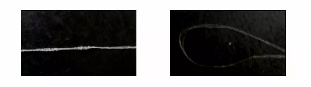 26 低彈絲與牽伸絲和預(yù)取向絲的鑒別 低彈絲不管怎樣去拉(只要力不是太大),其絲線縱向始終是卷曲的。牽伸絲稍許用力拉一下,其絲線縱向就會(huì)變得很平直。預(yù)取向絲稍許用力拉一下,其絲線會(huì)被拉長(zhǎng)很多,絲線縱向也會(huì)變得平直。
