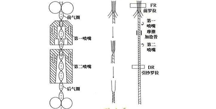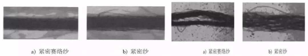 4 環(huán)錠紡雙股線與賽絡(luò)紡的鑒別 環(huán)錠紡是在細(xì)紗機(jī)上紡制而得到,而單紗紡紗的捻向都是Z捻,二根單紗并合采用S捻進(jìn)行并捻。而賽絡(luò)紡由兩根有一定間距的須條喂入細(xì)紗牽伸區(qū),分別牽伸后加捻成紗,且二根紗線是“Z”捻,加捻成紗后其捻向還是“Z”捻。因此看一下紗線的并合捻向,就能把二者區(qū)分開(kāi)來(lái)。 5 噴氣紡與渦流紡的鑒別 噴氣紗結(jié)構(gòu)分紗芯和外包纖維兩部分,紗芯平行且有捻度,結(jié)構(gòu)較緊密,外包纖維松散且無(wú)規(guī)則纏繞在紗芯外面,故噴氣紗結(jié)構(gòu)較蓬松,外觀較豐滿。而渦流紗結(jié)構(gòu)也分紗芯和外包纖維,芯纖維呈平行排列、無(wú)捻度,外包纖維呈規(guī)則螺旋包纏在紗芯表面,且外層規(guī)則螺旋包纏纖維比例較高,占總纖維的60%左右,以致于內(nèi)部末加捻的纖維幾乎被完全覆蓋,克服了噴氣紗露芯問(wèn)題,表面纖維排列則更接近于傳統(tǒng)環(huán)錠紗,結(jié)構(gòu)較緊密。 因此只要?jiǎng)冸x外層纖維,看里層纖維是否加捻與外層包纏纖維是否有規(guī)則就能將兩者區(qū)別出來(lái)。且噴氣紡主要是紡制化纖是棉的混紡、純化纖紗及其混紡紗,全棉沒(méi)有噴氣紡。